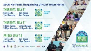 Attend the rally/picket action on Monday, May 5! The Alliance will be holding a kickoff rally and picket action in Harbor City at 5PM on May 5, the day before bargaining on our national contract starts. Having a large turnout at this event will make it clear to Kaiser that we’re ready for a strong contract. RSVP for the rally/picket action here: https://www.addevent.com/event/so25393958